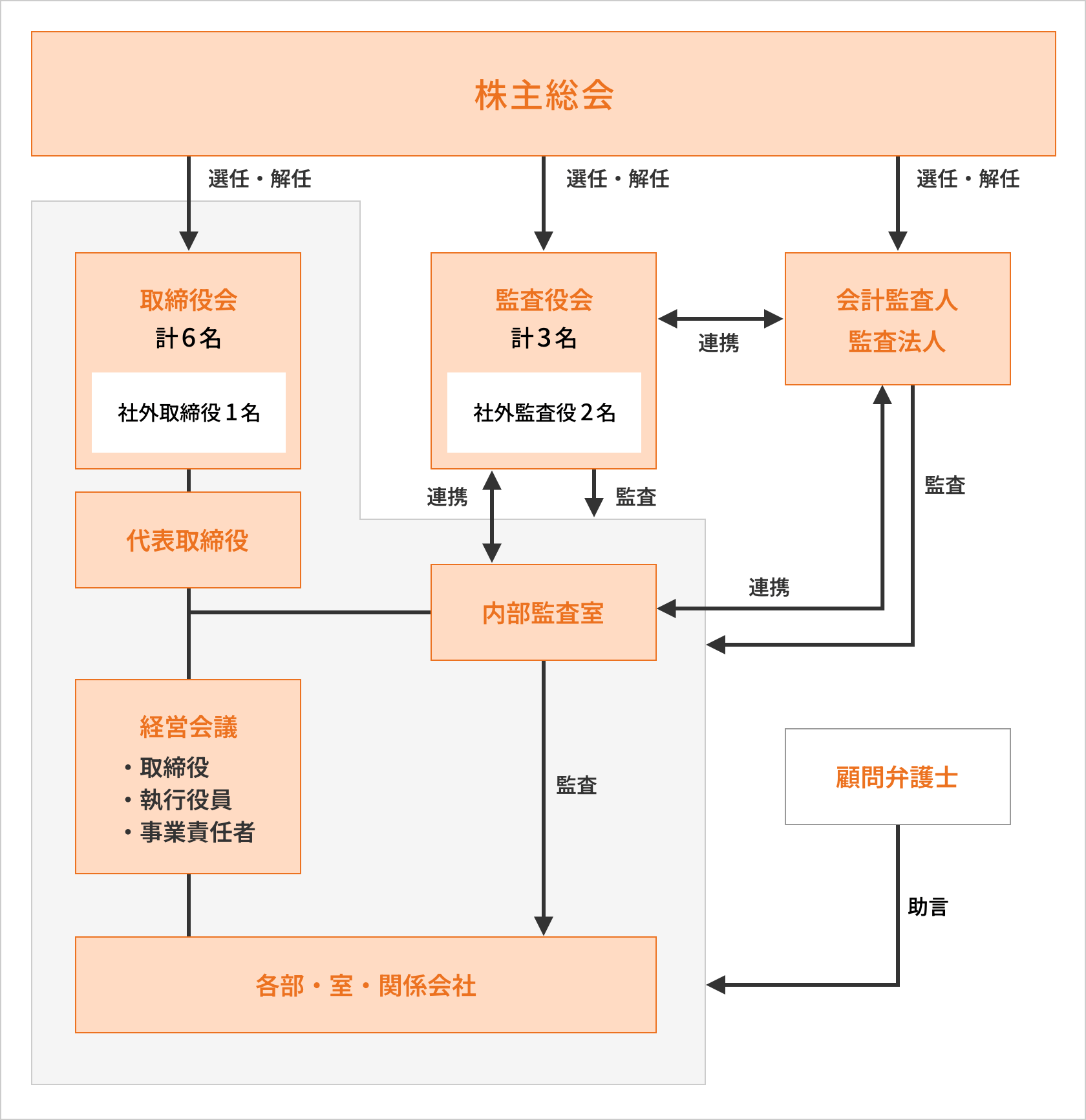 監査役会は、監査役3名(うち社外監査役2名)で構成されており、 取締役の執行の状況を客観的な立場から監査・監督を実施し、経営監視機能の充実を図っています。 当社のコーポレート・ガバナンスの体制は下図のとおりです。